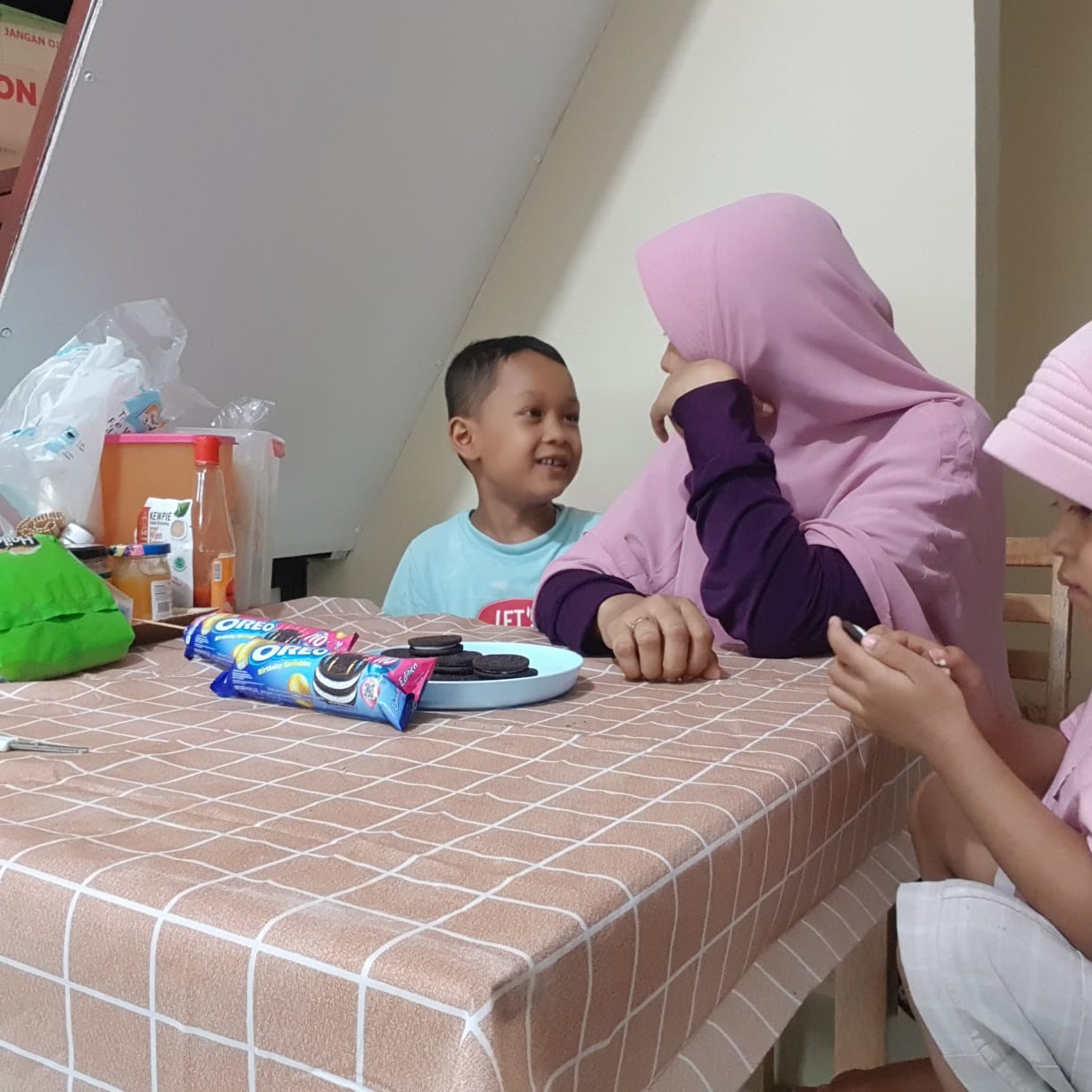 Jika suami sedang ada di rumah, biasanya pukul 2 siang sudah pergi menjemput bersama sang adik. Namun, jika ia sedang dinas keluar kota. Ada ojek yang bisa mengantar atau menjemputnya. Kira-kira pukul setengah 3 siang jadi sangat berharga, seusai ia pulang sekolah dan mengganti baju. Kami duduk di meja makan, sambil menyantap camilan.
