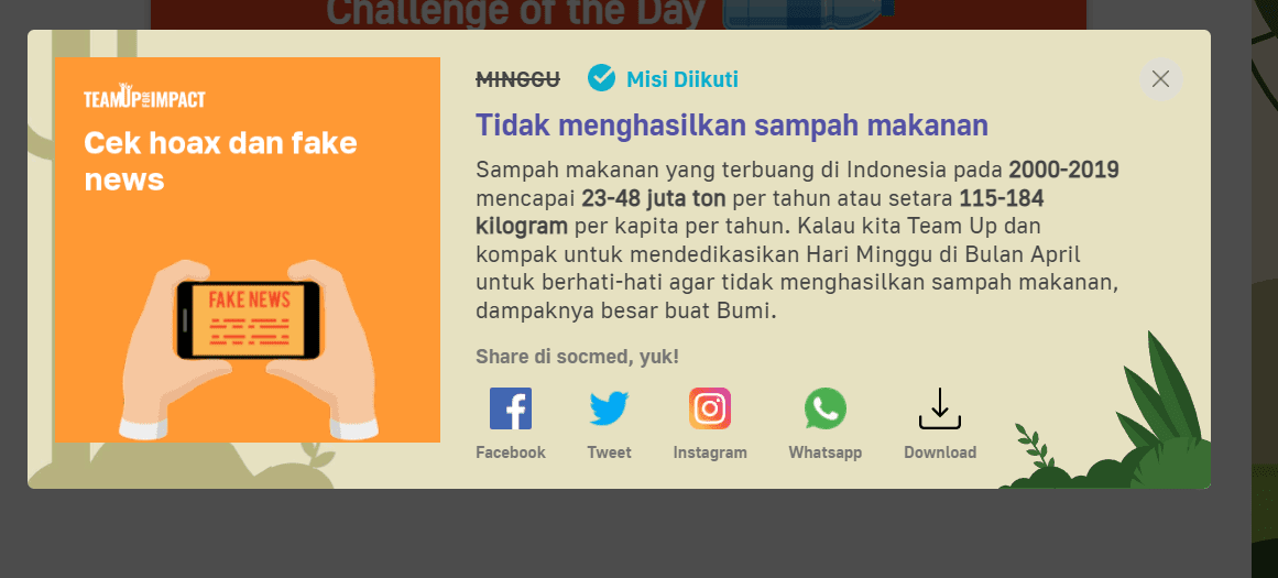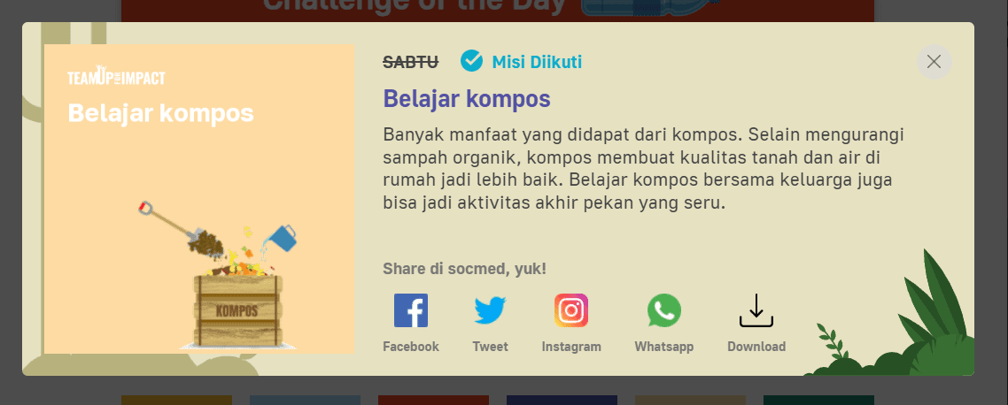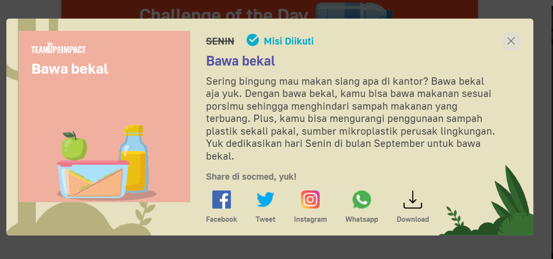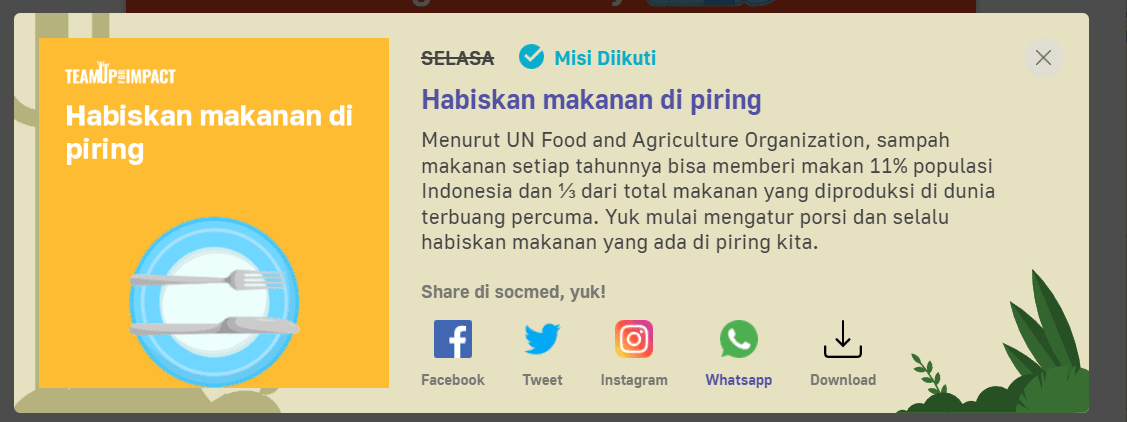 Dengan misi harian yang ada di Team Up For Impact Everyday dan dapatkan 100 poin untuk join dan 100 poin untuk share di medsos.