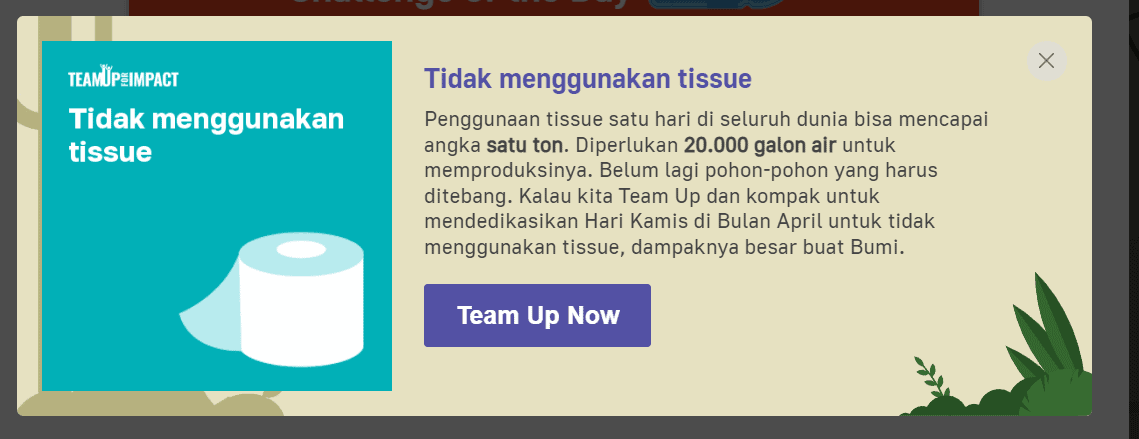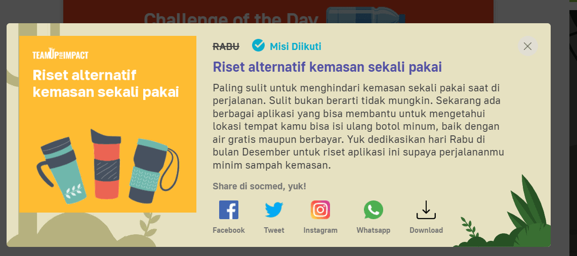 Bersama Team Up For Impact Terdapat 32 tantangan yang bisa diikuti setiap hari dan telah diikuti oleh 1.243 orang lebih. Setiap orang yang mengikuti tantangan dan memperoleh point 1.400 akan mendapatkan pohon untuk di tanamkan di hutan dan ikut serta menyelamtkan bumi. Seperti hari kemarin, challengenya adalah mengurangi penggunaan botol kemasan sekali pakai air mineral.