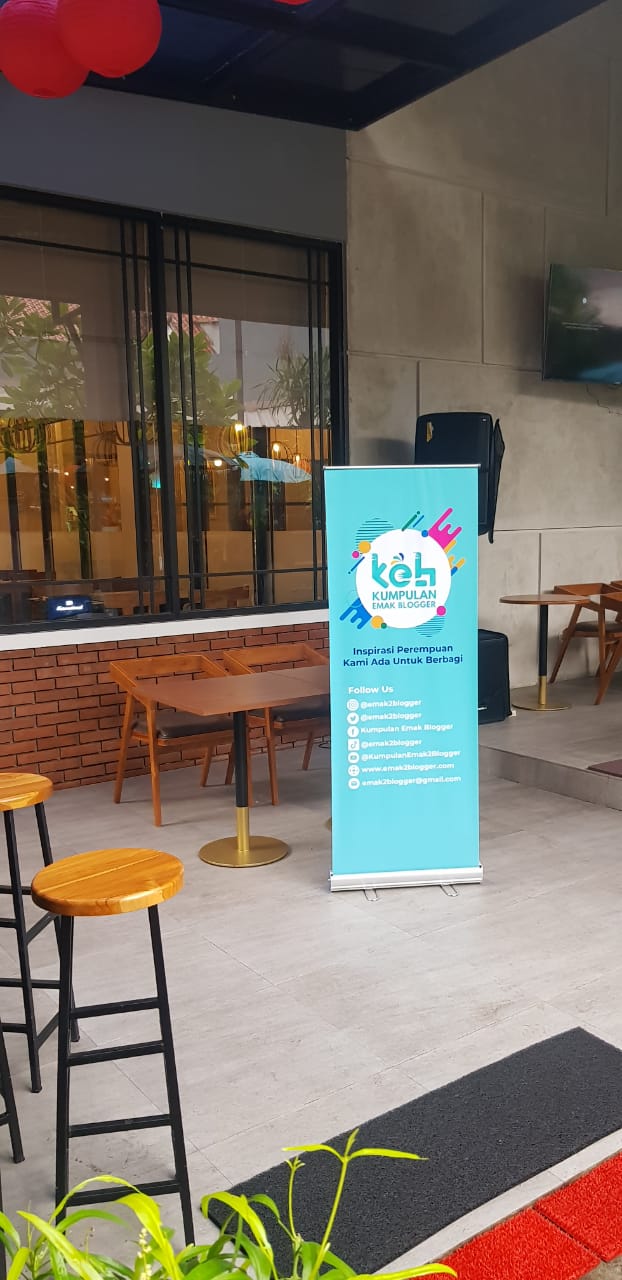Saat pertama kali datang ke lokasi, tamu undangan disambut hangat oleh para staff café. Hari itu saya dating sendiri, jam sudah menunjukkan pukul 12 lewat 10. Setelah isi presensi kehadiran, di bagian depan café saya langsung bertemu dengan Mira Sahid. Kebetulan kami pernah terlibat di kerja sama yang lain, jadi saya sudah hapal muka beliau. Nampaknya asing bagi saya karena baru aktif di komunitas ini semenjak pandemi. Wajah-wajah emak blogger se-jabodetabek ini. Rata-rata yang saya ajak bicara memang sudah lama berkomunitas di KEB ini.