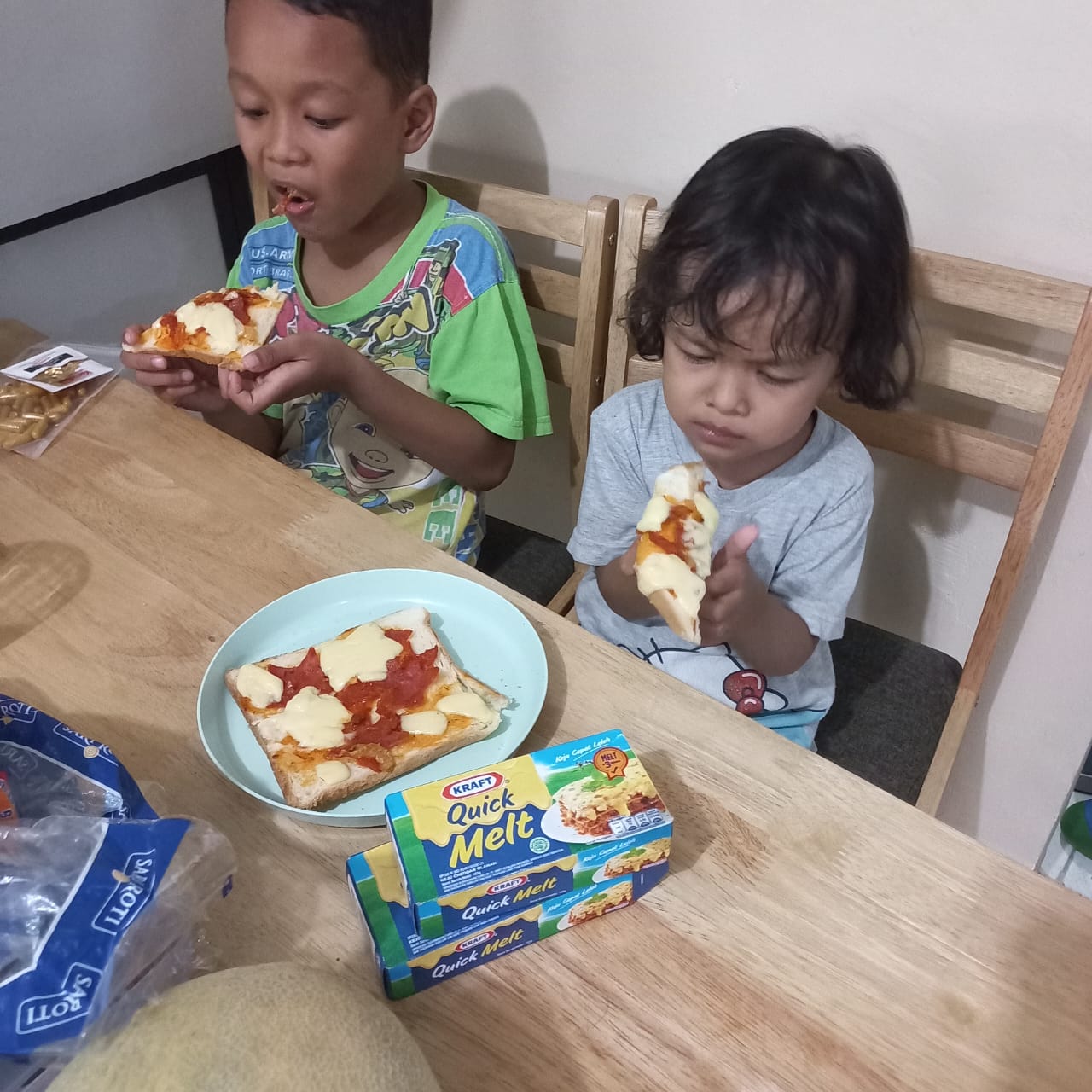Memasak bersama jadi menyenangkan dan jadi sarana bonding dengan ana-anak. Belum lagi lihat wajah cerianya yang lahap makan camilan roti pizza @kraft.id quick melt yang pasti leleh dalam 3 menit.